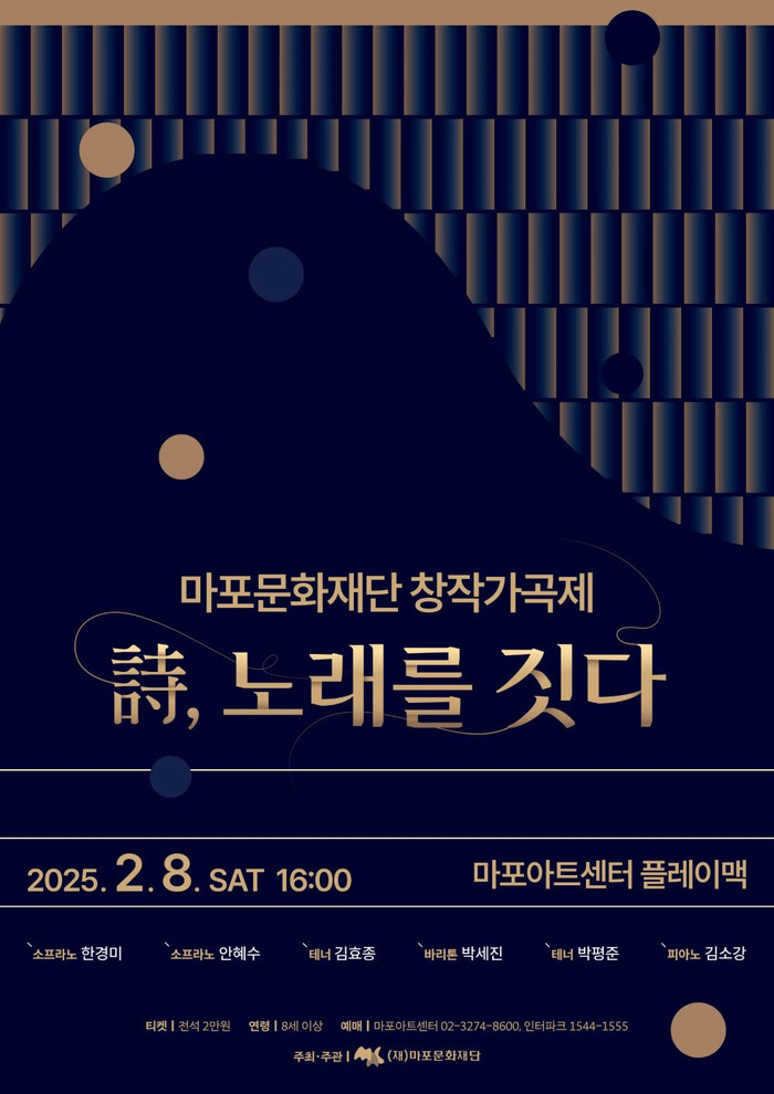 [시민일보 = 문민호 기자] 마포문화재단(대표이사 송제용)은 오는 2월 8일 마포마트센터 플레이맥에서 2025 마포문화재단 창작가곡제 <詩(시), 노래를 짓다>를 개최한다. 재단은 2022년부터 매년 한글날 창작시 공모전 <훈민정음 망월장>을 개최하며 순우리말 노랫말을 공모 받아 시민이 쓴 노랫말로 가곡과 동요를 창작하며 우리나라 한글의 아름다움을 노래로 알려왔다. 이번 공연에서는 재단이 자체 제작한 트렌디한 창작가곡 6개 작품과 오랫동안 사랑 받아온 서정적인 명가곡들을 동시에 만날 수 있는 특별한 무대를 준비했다.
