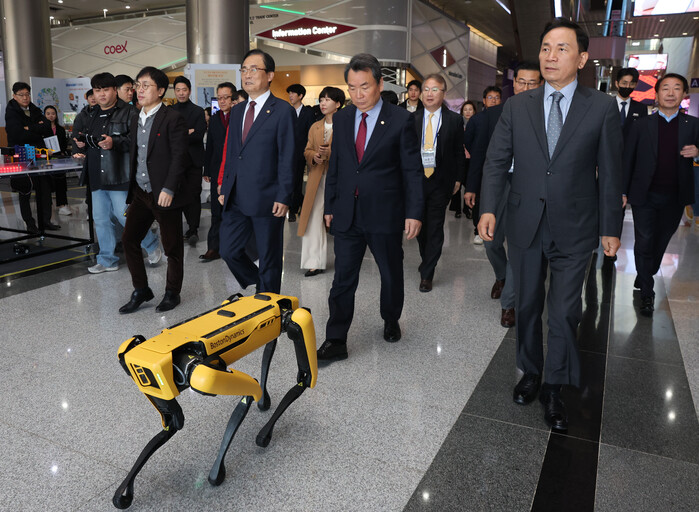 | ▲ 로봇 개 스팟이 조성명 구청장(오른쪽)과 개막식 참석 내빈들을 행사장까지 안내하고 있다. (사진=강남구청 제공) |