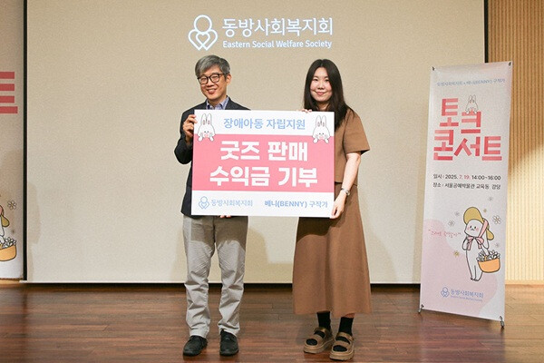 | ▲ 동방사회복지회(회장 김진숙)는 7월 19일 서울공예박물관 교육동에서 열린 ‘베니 구작가 토크 콘서트’에서 굿즈 판매 수익금 일부를 기부하는 전달식을 진행했다. (좌)김현기 사무총장 (우) 베니(BENNY) 구작가 |