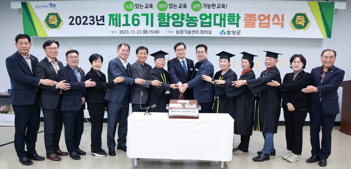 군은 함양농업의 미래를 이끌어갈 전문농업인 육성을 위해 2008년부터 함양농업대학을 운영하여 지난해까지 15년간 32개 학과 1,118명이 졸업하였으며, 올해 16기 농업대학 졸업식에서는 24명이 졸업함으로써 총 1,142명의 졸업생을 배출하게 되었다.