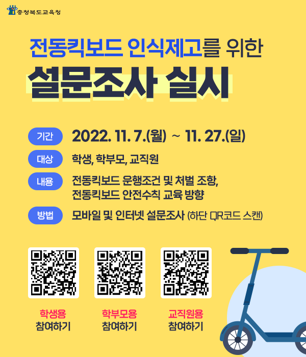 이번 인식도 제고 설문조사는 최근 청소년의 무면허 전동킥보드 운전이 늘면서 안전사고에 무방비로 노출되고 있는 청소년을 보호하고 안전의식 고취를 위한 목적으로 마련됐으며, 설문 결과는 학교안전교육 계획 수립 및 학생 인식 정도에 따른 교육자료로 활용할 방침이다.