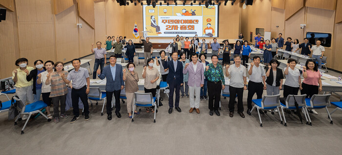 | ▲ 지난해 열린 양천구 주민참여예산심의위원 2차 총회에 참석한 이기재 구청장이 위원들과 기념촬영을 하고 있다. (사진=양천구청 제공) |