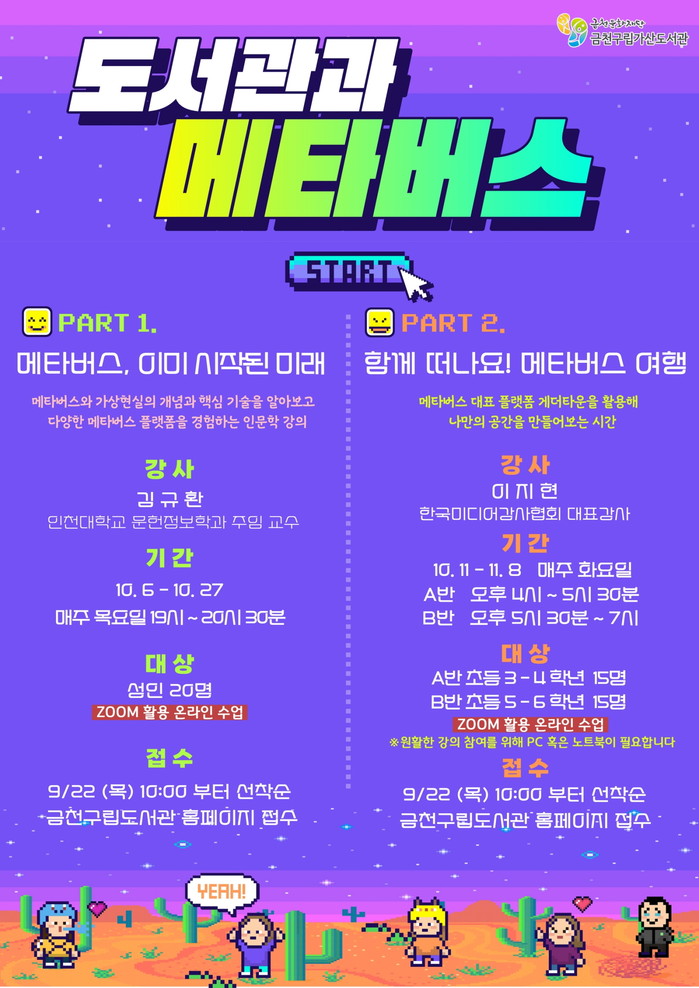 [시민일보 = 여영준 기자] 서울 금천문화재단은 금천구립가산도서관에서 메타버스를 이해하고 경험할 수 있는 프로그램 ‘도서관과 메타버스’를 오는 10월6일부터 운영한다고 밝혔다.