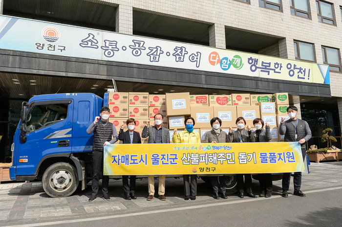 서울 양천구는 최근 심각한 산불 피해를 입은 자매도시 경북 울진군에 햇반 95상자 등 긴급 구호물품을 전달했다. 울진군은 이번 산불로 주택 270여채를 비롯해 약 1만7000ha의 산림이 소실되는 등 큰 피해를 입었다. 사진은 울진군에 전달할 구호물품 앞에서 기념촬영 중인 김수영 구청장(왼쪽 네 번째)과 직원의 모습. (사진제공=양천구청)