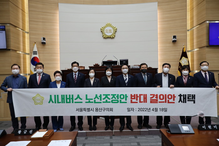 [시민일보 = 홍덕표 기자] 서울 용산구의회(의장 김정재)는 최근 열린 제273회 임시회 본회의에서 2016번, 3012번 버스를 이용하는 구민의 생존권과 이동권을 침해하는 서울시 '시내버스 노선조정안'에 대한 반대를 표명하며, 시에서 용산구민의 의견을 적극 반영할 것을 촉구하고자 '시내버스 노선조정안 반대 결의안'을 발표했다.