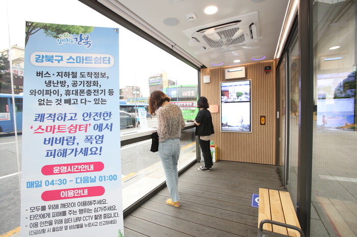 [시민일보 = 홍덕표 기자] 서울 강북구(구청장 이순희)는 대중교통을 이용하는 주민이 많은 미아사거리역 1번 출구 및 수유역 6번 출구 부근 버스정류소에 냉난방기와 첨단 편의시설을 갖춘 '스마트 쉼터'를 설치해 운영하고 있다고 30일 밝혔다.
