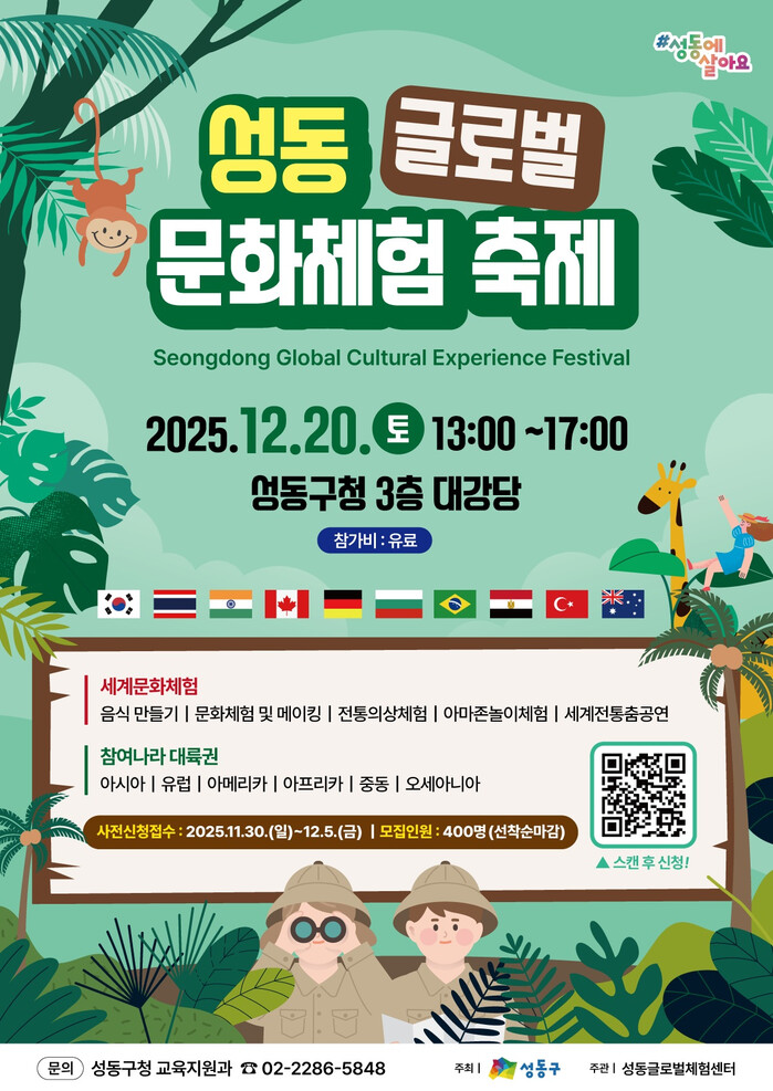 [시민일보 = 박소진 기자] 성동구(구청장 정원오)가 오는 20일 오후 1시부터 5시까지 성동구청 3층 대강당에서 ‘2025 성동 글로벌 문화체험 축제’를 개최한다고 밝혔다.