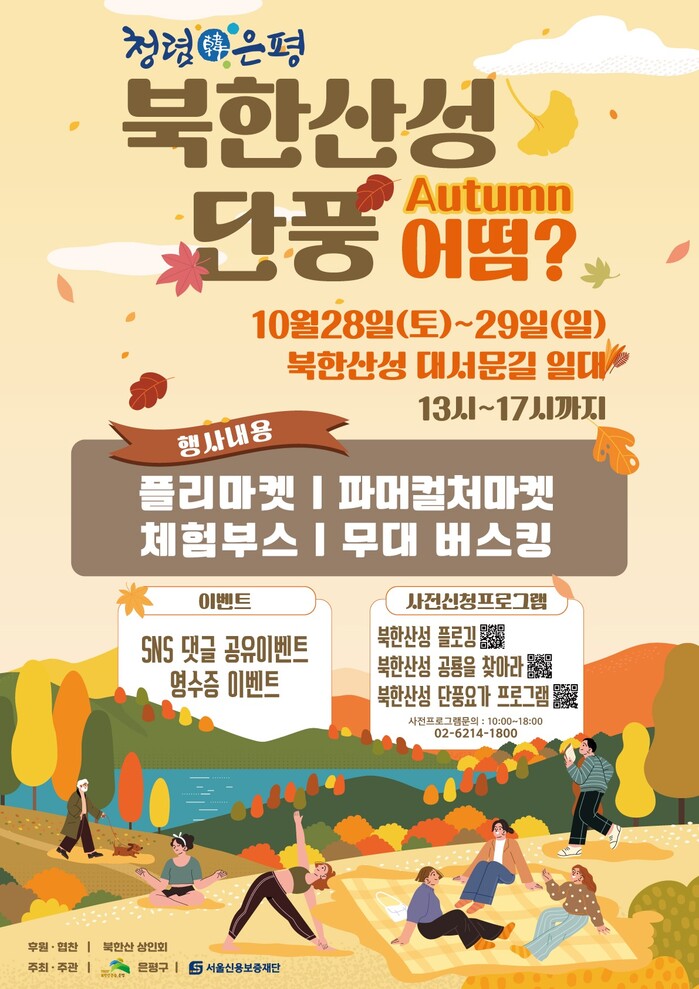 [시민일보 = 이대우 기자] 은평구(구청장 김미경)가 오는 28~29일 북한산성 입구(대서문길 상권)’서 골목상권 활성화를 위한 ‘북한산성 단풍 어떰(Autumn)?’을 개최한다고 밝혔다.
