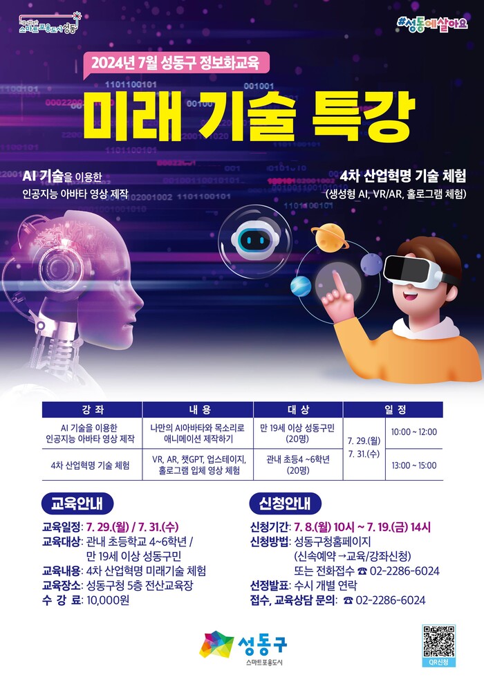 29일 AI 특강은 지역내 4학년 이상 초등학생 대상으로 진행되고, 31일에 열리는 4차 산업혁명 특강은 만 19세 이상 성동구민 누구나 참여 가능하다. 희망자는 8~19일 오후 2시까지 홈페이지을 통해 신청할 수 있다. 보다 자세한 내용은 성동구청 누리집 공지사항을 통해 확인할 수 있다.