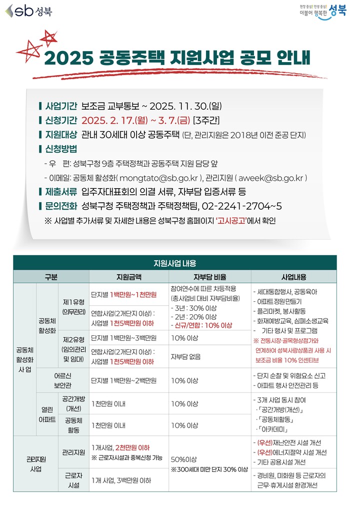 [시민일보 = 문민호 기자] 성북구(구청장 이승로)는 ‘2025년 공동주택 지원사업’을 공모한다고 12일 밝혔다.