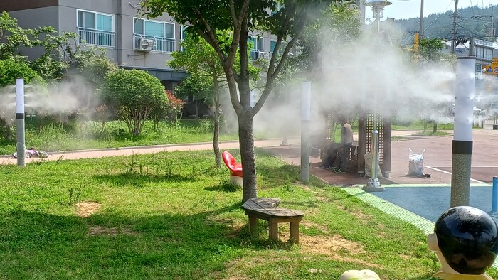 물안개 분사장치(쿨링포그)는 정수 처리한 물을 특수 노즐을 통해 빗방울의 1000만분의 1 크기의 인공 안개로 분사하는 것으로, 더운 공기와 만나 기화하면서 주위 온도를 3~5도가량 낮추는 효과가 있다.