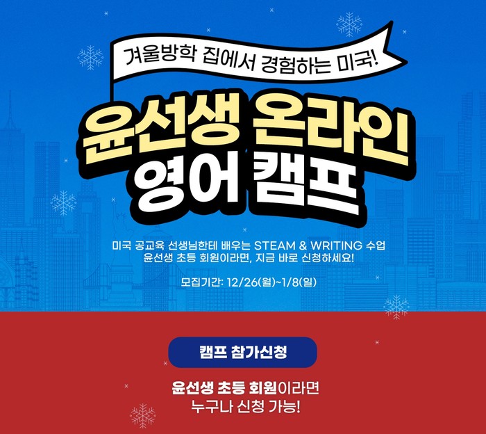 [시민일보 = 여영준 기자] 영어교육 전문기업 윤선생은 초등 회원을 대상으로 ‘윤선생 온라인 영어 캠프’를 열고, 오는 2023년 1월8일까지 참가 신청을 받는다고 28일 밝혔다.