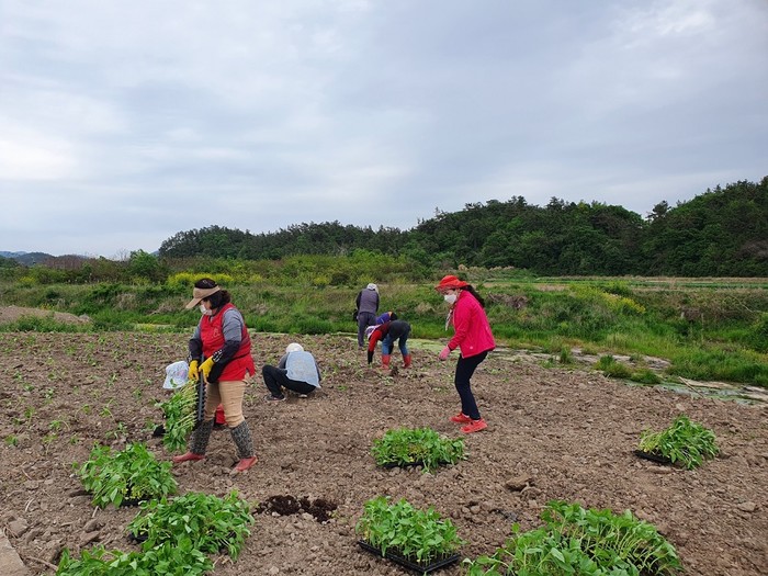 | ▲ 황산면 연자마을 주민들이 해바라기길 조성을 위해 해바라기 묘종심기 작업을 하고 있다. / 사진=해남군 제공 |