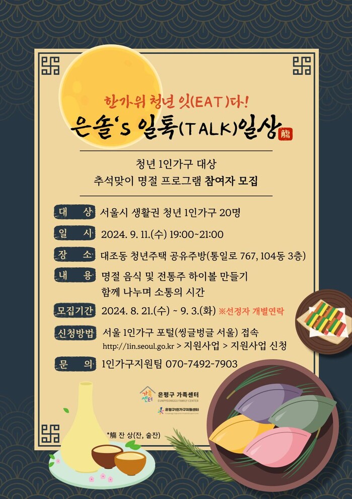 [시민일보 = 이대우 기자] 서울 은평구(구청장 김미경)는 혼자서 추석을 지내는 청년 1인가구를 위해 오는 11일 ‘한가위 청년을 잇다(EAT)! ‘은솔’s 일톡일상’ 소셜다이닝‘을 운영한다고 밝혔다.