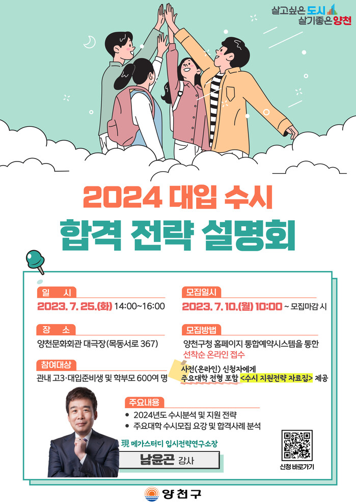 설명회는 7월 25일 오후 2시 양천문화회관 대극장에서 2시간 동안 진행된다. 구는 7월 10일 오전 10시부터 양천구청 누리집 통합예약포털에서 수강생 총 600명을 선착순으로 모집한다. 온라인 사전신청자에게는 주요 대학의 모집요강이 담긴 ‘2024 수시 지원전략 자료집’을 제공할 계획이다.