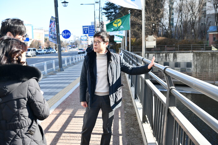 경기 수원시 영통구가 최근 원천교 및 영통구청 인근 주요 구간을 대상으로 꽃길 조성 대상지에 대한 현장 점검을 했다. 이번 현장 점검은 도심 주요 보행축을 중심으로 계절감을 살린 꽃길을 조성해, 주민들이 일상 속에서 꽃과 녹지를 가까이에서 느끼며 잠시 힐링할 수 있는 거리 환경을 마련하기 위해 진행됐다. 사진은 현장을 찾은 장수석 구청장(오른쪽)이 관계자와 이야기를 나누고 있는 모습. (사진=영통구청 제공)
