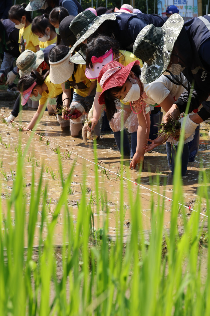 17일 오전 서울 양천구 신트리공원 논체험장에서 어린이들이 모내기 체험을 하고 있다.