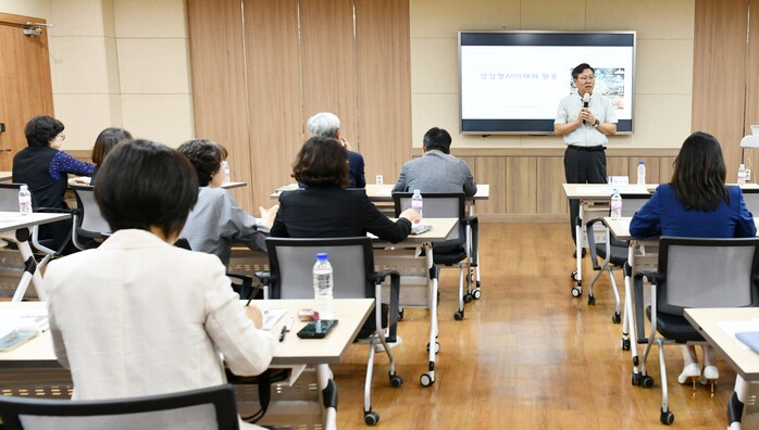 경기 수원시 영통구는 25일 영통구 소속 직급 5급 이상의 간부 공직자들을 대상으로 '생성형AI에 대한 이해와 공공부문 활용 방안'을 주제로 한 체험 교육을 진행했다. 이날 교육에는 박사승 구청장과 박승진 대민협력관을 비롯한 영통구 24개 부서장(과·동장)이 모두 참석했다. 사진은 박 구청장이 인사말을 하고 있는 모습. (사진=영통구청 제공)