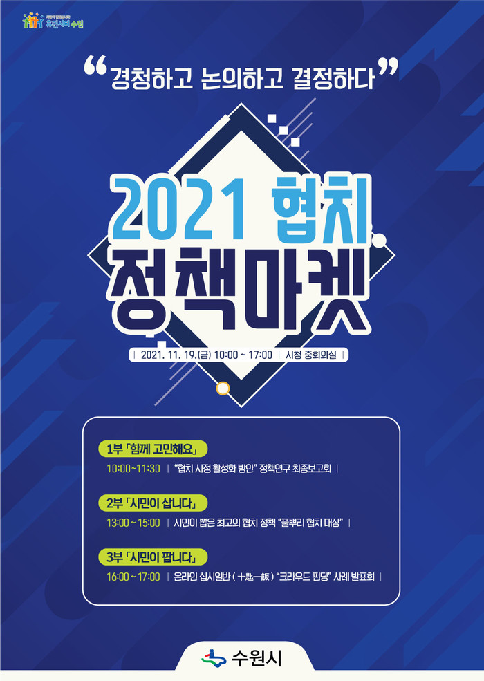 [수원=임종인 기자] 경기 수원시가 민선 5~7기 '수원시 협치(거버넌스) 정책'을 되짚어보고, 우수 협치 정책을 선정하는 '2021 협치 정책 마켓'을 오는 19일 개최한다.