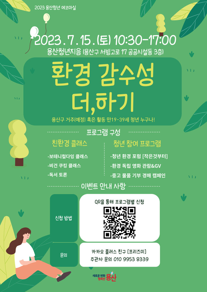 [시민일보 = 홍덕표 기자] 서울 용산구(구청장 박희영)가 오는 15일 용산청년지음에서 청년 환경 캠페인 ‘환경감수성 더,하기’ 행사를 개최한다.