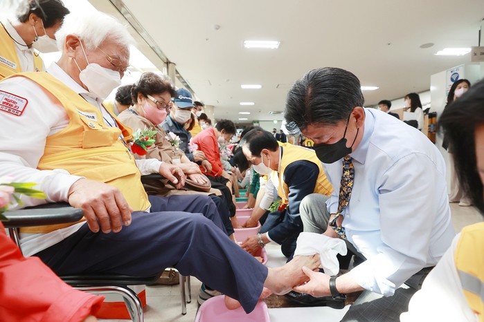 대한적십자사봉사회 광주지구협의회는 27일 경기 광주시 노인복지관에서 '제19회 어르신 효 잔치'를 개최해 노인들을 공경하는 마음을 표하고자 세족식을 열고 적십자 봉사원들이 만든 점심 식사를 대접했다. 사진은 이날 방세환 시장(오른쪽)이 세족식에서 한 노인의 발을 닦아 주고 있는 모습. (사진제공=광주시청)