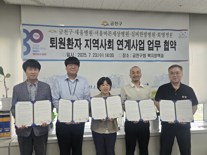 [시민일보 = 여영준 기자] 금천구(구청장 유성훈)가 최근 구청에서 지역내 의료기관 새움병원, 서울바른세상병원, 실버한방병원, 희명병원과 ‘퇴원환자 지역사회 연계사업’ 업무협약을 체결했다.