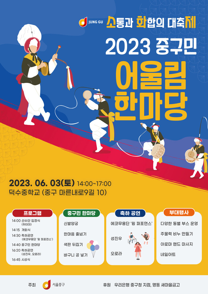 [시민일보 = 여영준 기자] 서울 중구(구청장 김길성)가 오는 3일 덕수중학교에서 '2023 중구민 어울림 한마당'을 연다고 밝혔다.