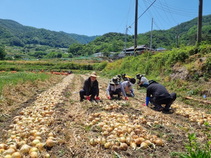 이날 직원들은 고령화로 인해 농작업에 어려움이 있으며, 농번기 일손을 구하지 못해 작업에 어려움이 있는 농가에 양파 수확 작업을 도우며 일손을 보탰다.