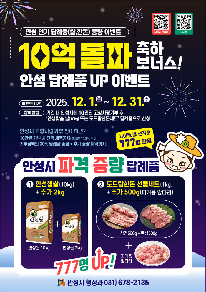 증량 내용은 다음과 같다. 안성쌀은 기존 10kg에서 2kg 추가된 12kg으로 제공되며, 도드람한돈 선물세트는 삼겹살 500g + 목심 500g 세트에 앞다리살 500g이 추가로 제공된다. 이벤트 물량은 각 사이트별·답례품별 777명 한정이다.