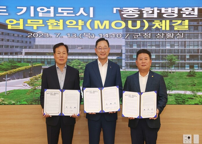 해남군과 해남우리종합병원, 서남해안기업도시개발(주)은 13일 군청 상황실에서 솔라시도 기업도시 종합병원 건립 업무협약을 체결했다.