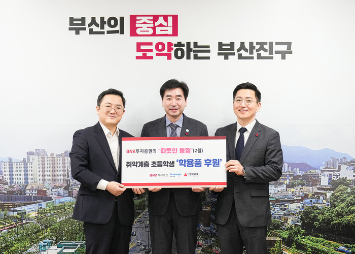 BNK투자증권은 이날 오전 부산진구청을 방문해 학습용 노트와 필기구 등 9종으로 구성된 학용품 세트 전달식을 가졌다.