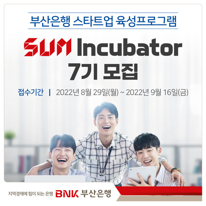 [시민일보 = 여영준 기자] BNK부산은행은 지역 스타트업 육성 프로그램인 ‘썸 인큐베이터(SUM Incubator)’ 7기를 모집한다고 밝혔다.