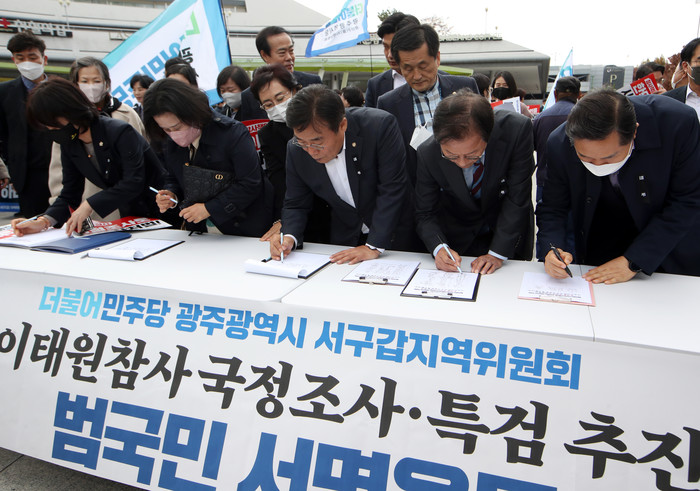 민주당 관계자는 14일 “지난 11일 이재명 대표가 직접 ‘이태원 참사 범국민 서명운동’을 공표한 데 이어 광역시도당 차원에서 서명운동본부 발대식을 열며 본격적인 장외투쟁에 나선다”고 밝혔다.
