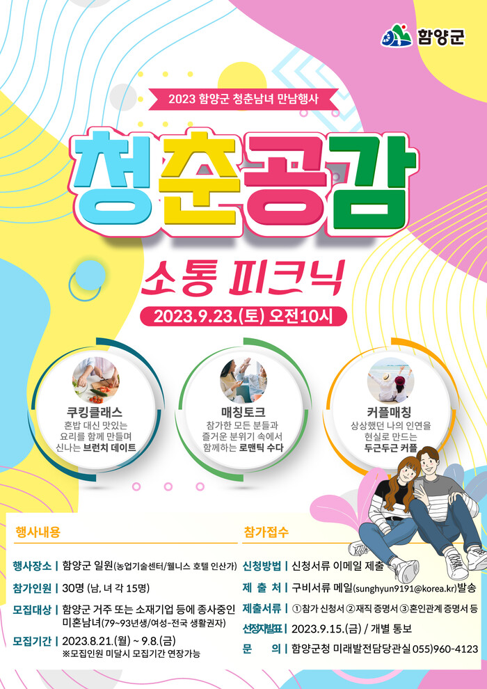 지난해에 이어 3번째 진행되는 ‘청춘공감 소통 피크닉’은 오는 9월 23일(토) 인산연수원과 군 농업기술센터 군민요리교육관 일원에서 열리며, 쿠킹클래스와 일대일 매칭 토크, 힐링 매너 특강, 디너파티, 커플매칭 등 미혼남녀가 자연스럽게 가까워질 수 있는 자리를 마련할 예정이다.