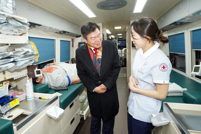| ▲ 8일 직원 단체 헌혈 버스를 찾아 의료진과 헌혈 참여 직원에게 감사의 뜻을 전한 이필형 동대문구청장 (사진=동대문구청 제공) |