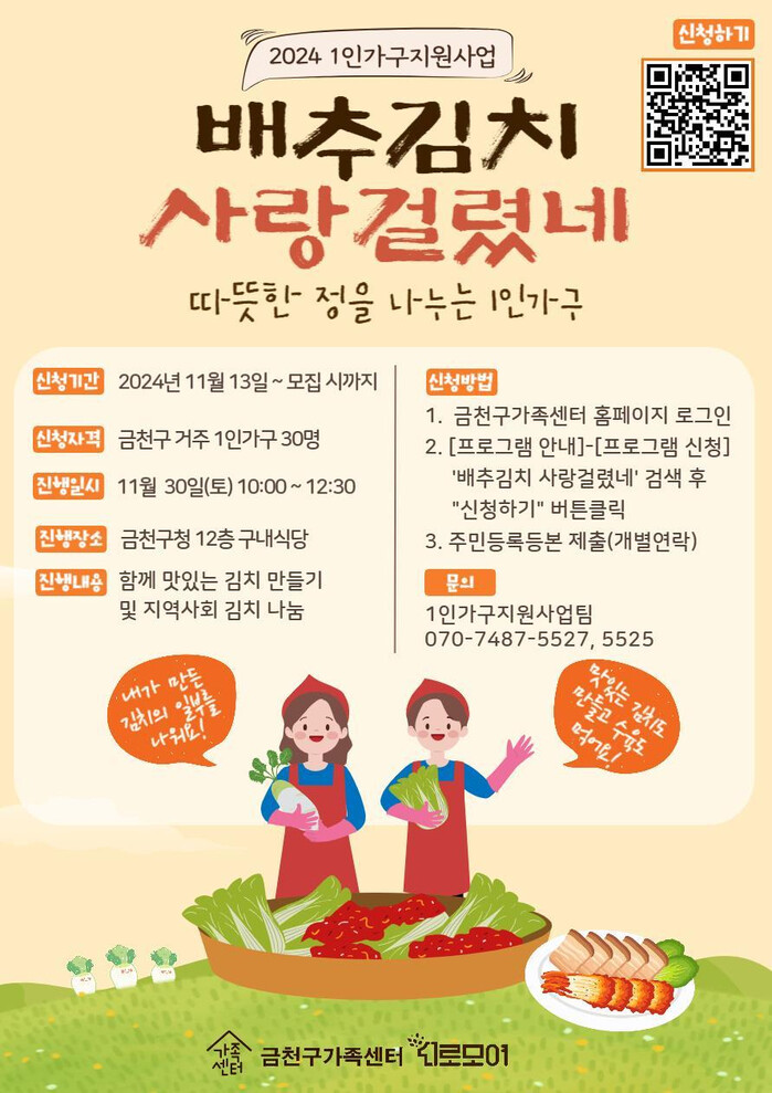[시민일보 = 여영준 기자] 금천구(구청장 유성훈)는 30일 오전 10시 구청 구내식당에서 1인 가구 김장 행사 ‘배추김치 사랑걸렸네’를 진행한다고 밝혔다.