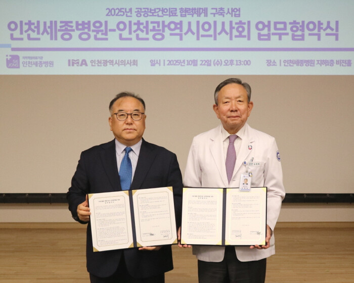 협약식에는 인천세종병원 오병희 병원장·김경섭 공공의료본부장·장현근 공공의료협력실장·문상영 공공의료사업팀장과 인천시의사회 박철원 회장·김인성 사무처장·김영재 총무과장 등이 참석했다.