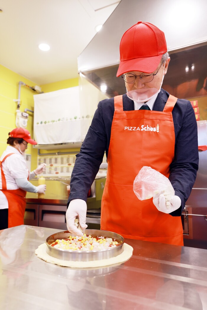 서울 구로구가 20일 피자스쿨 구로항동점에서 결손ㆍ다문화 가정 아동 300명에게 피자를 전달하는 '제3회 정다운 피자 나눔데이'를 개최했다. 이날 행사에는 장인홍 구청장이 직접 참석해 피자 만들기 시연에 참여하며 따뜻한 나눔에 동참했다. 사진은 장 구청장이 피자 만들기에 참여하는 모습. (사진=구로구청 제공)