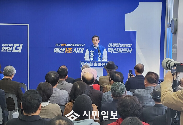 | ▲ 우승희 영암군수 예비후보가 23일 선거 사무실에서 군민 및 지지자 등이 참석한 가운데 군수 예비후보 출마를 선언하고 있다, / 우승희 예비후보 캠프 제공 |