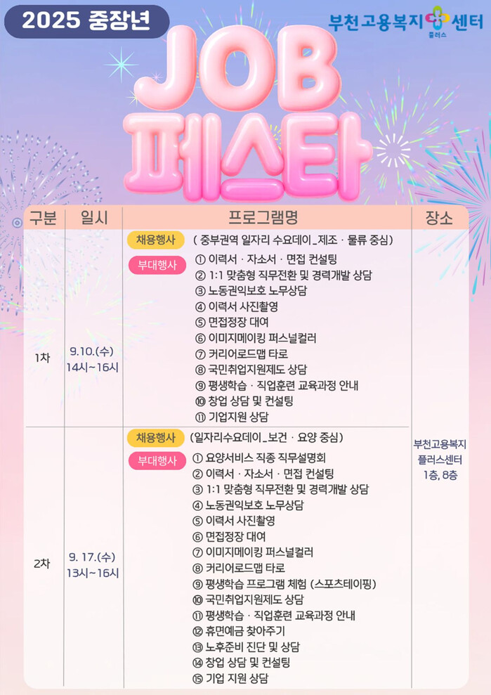 [부천=문찬식 기자] 경기 부천시가 10일과 17일 오후 2시부터 4시까지 부천고용복지플러스센터에서 ‘2025년 중장년 잡(JOB)페스타’를 연다.
