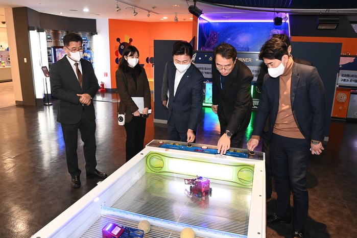 조용익 경기 부천시장이 17일 새해 첫 행보로 로봇기업 간담회를 개최했다. 간담회에 참석한 기업인들은 최근 원자재 가격급등 등으로 어려워진 경영상황을 언급했으며, 대장동 등 산업단지 세부조성계획 등의 다양한 주제로 논의를 이어갔다. 사진은 조 시장(왼쪽 세 번째)이 로보파크 로봇전시물을 체험하고 있는 모습. (사진=부천시청 제공)