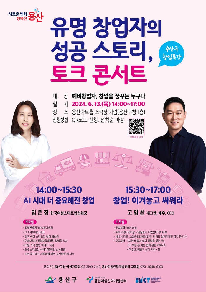 [시민일보 = 변은선 기자] 용산구(구청장 박희영)가 오는 13일 오후 2~5시 용산아트홀 소극장 가람(녹사평대로 150 1층)에서 ‘유명 창업자의 성공 스토리, 토크 콘서트’ 창업 특강을 개최한다.