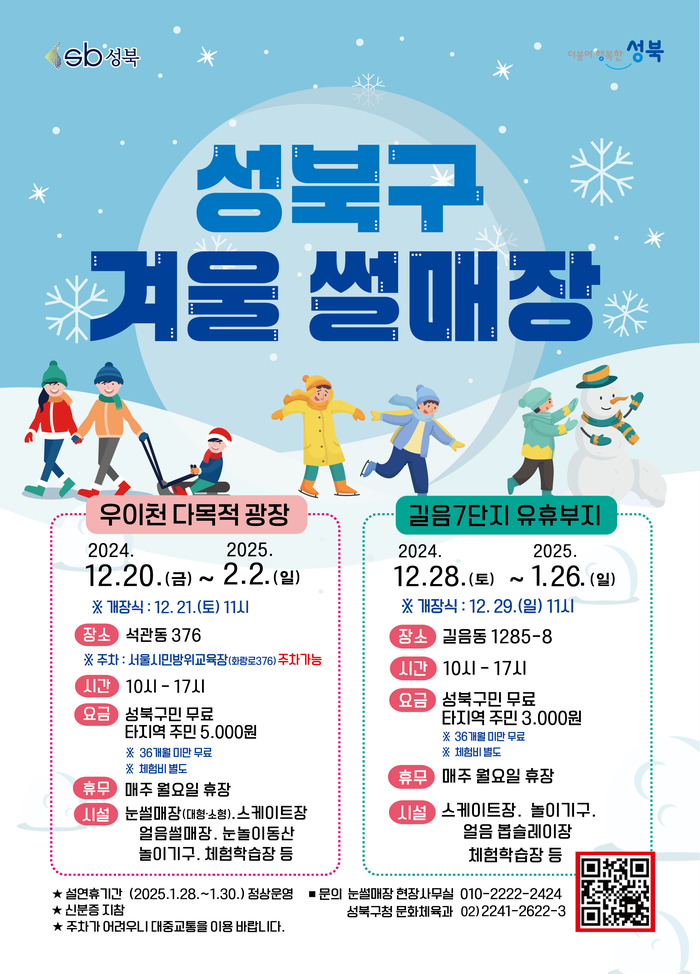 이승로 구청장은 “안전하고 재미있는 최고의 겨울 놀이터가 될 수 있도록 최선을 다해 준비했다”라며 “이번 성북구 겨울 썰매장을 통해 온 가족 다양한 겨울 놀이를 체험하고 행복하고 멋진 추억을 만들길 바란다”라고 말했다.