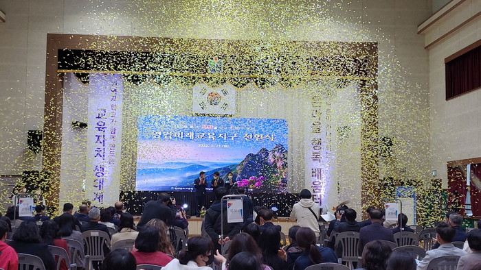 전남 영암교육지원청과 영암군청은 21일 '2022 영암미래교육지구 선언식'을 개최했다. 미래교육지구는 교육(지원)청과 지자체 간 지속 가능한 교육협력체제를 구축하고, 다양한 교육협력 모델 개발과 확산을 지원하기 위한 교육부 공모 사업이다. 사진은 선언식이 진행되고 있는 모습. (사진제공=영암교육지원청)