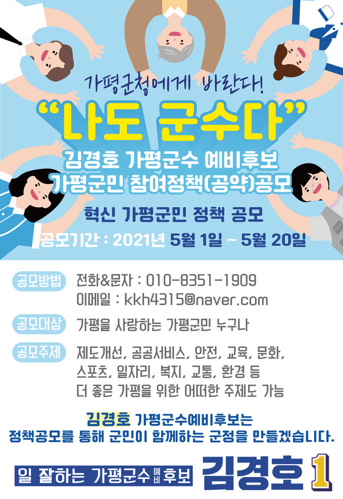[수원=채종수 기자] 김경호 가평군수후보가 군민과 함께하는 군정을 위한 ‘나도 군수다’ 정책 공모전을 오는 20일까지 개최한다.