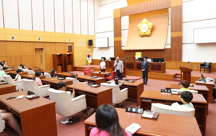 의회 견학 프로그램은 학생들에게 지방의회의 역할과 기능에 대한 이해를 돕기 위한 프로그램으로 ▲지방의회 역할과 기능 소개 ▲의회 홍보영상 시청 ▲본회의장 시설 안내 ▲기념사진(단체사진, 의장석 사진) 촬영 순으로 진행했다.