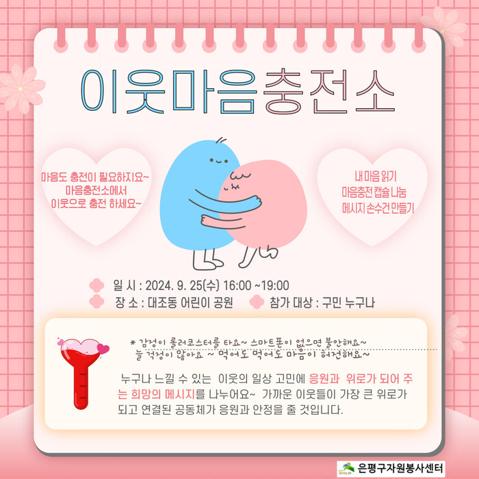 [시민일보 = 이대우 기자] 서울 은평구(구청장 김미경)는 오는 25일 대조어린이공원에서 이웃 간 서로 마음을 돌보는 자원봉사 프로그램인 ‘이웃마음 충전소’를 운영한다고 밝혔다.