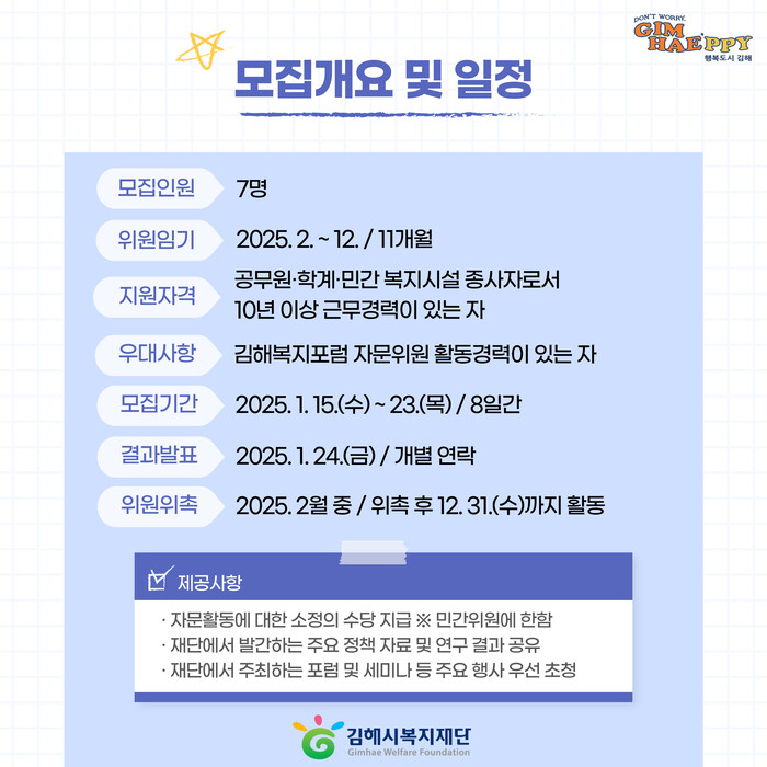 (재)김해시복지재단(대표이사 임주택)은 오는 23일까지 “2025년 김해복지포럼 자문위원”을 모집한다고 15일 밝혔다.