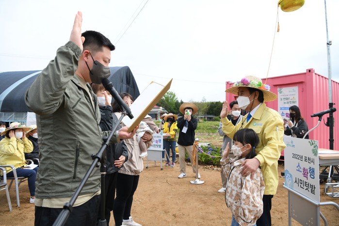 경기 포천시농업기술센터가 최근 ‘소확행 시민텃밭’을 개장했다. 시민텃밭은 군내면 명산리에서 오는 11월5일까지 운영되며 가구당 분양면적은 약 16㎡(약 5평)이다. 사진은 이날 개장식에서 박윤국 시장(오른쪽)이 참여자들과 함께 선서를 하고 있는 모습. (사진제공=포천시청)