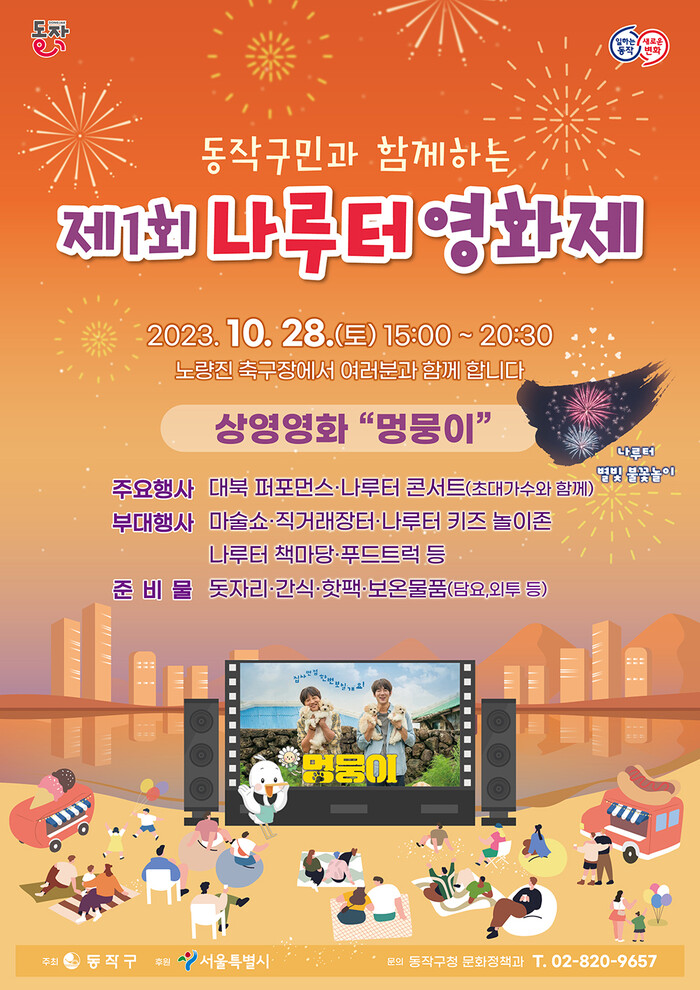 [시민일보 = 여영준 기자] 서울 동작구(구청장 박일하)가 오는 28일 오후 3시 노량진축구장(노들로 688)에서 가을 정취를 만끽할 수 있는 ‘제1회 나루터 영화제’를 개최한다.